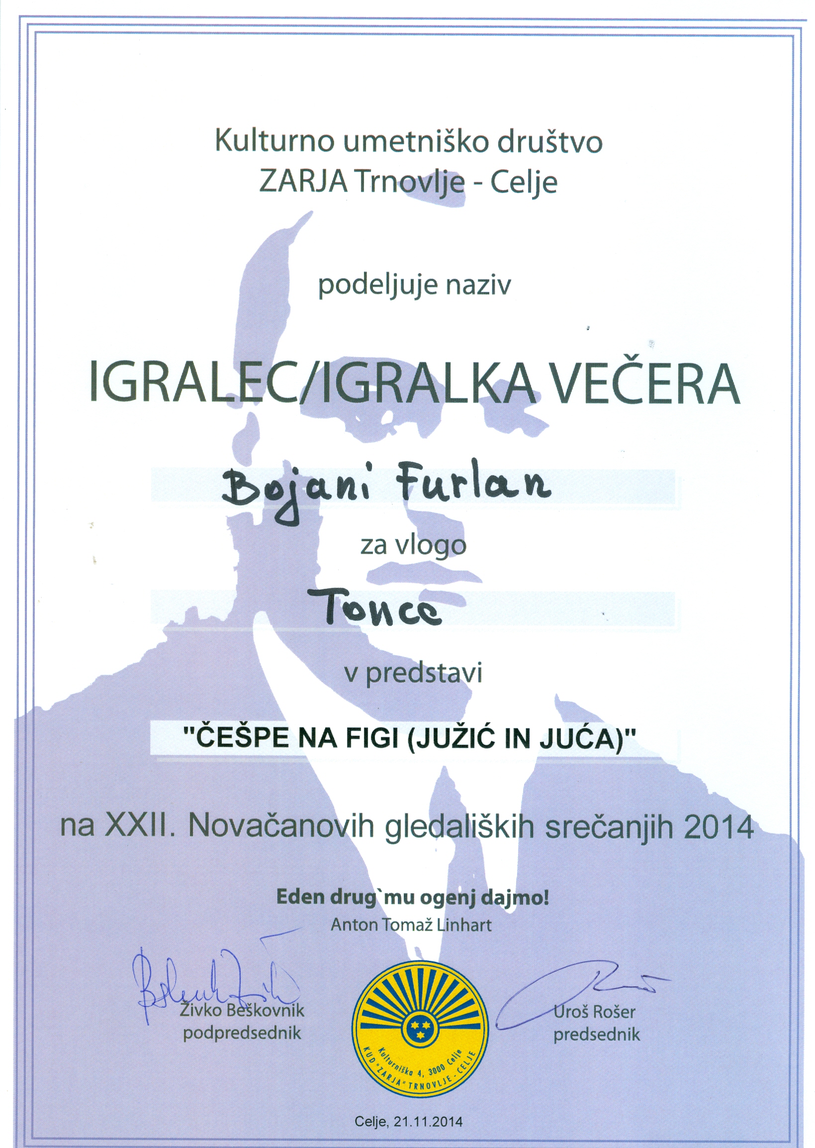 "ČEŠPE NA FIGI" - NA FESTIVALU "XXII. NOVAČANOVA GLEDALIŠKA SREČANJA" V TRNOVLJAH PRI CELJU JE NAŠA IGRALKA BOJANA FURLAN ZA VLOGO TONCE PREJELA NAZIV "IGRALKA VEČERA" (Trnovlje- Celje, 21.11.2014)